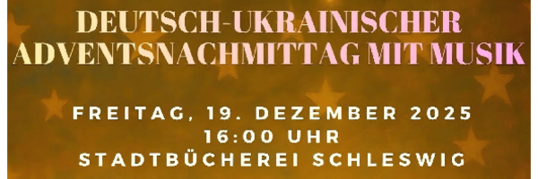 Die Stadtbücherei lädt am 19.12.2025 ab 16:00 Uhr zu einem deutsch-ukrainischen Adventsmittag ein. Gemeinsam mit der Kreismusikschule Schleswig-Flensburg und der ukrainischen Künstlerin Oksana Haidaienko entsteht ein besonderer Nachmittag.