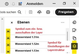 Um die PDF-Datei mit den Hochwasserlinien öffnen zu können, wird der kostenlose Adobe Acrobat Reader empfohlen. Nach dem Download der Hochwasserkarte können über die Layerstruktur einzelne Höhenlinien ein- bzw. ausgeschaltet werden.