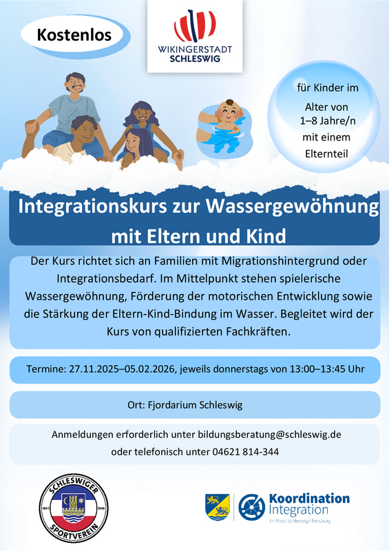 Die Bildungsberatung der Stadt Schleswig bietet ab dem 27. November 2025 einen kostenlosen Integrationskurs zur Wassergewöhnung mit Eltern und Kind an. Der Kurs richtet sich an Familien mit Migrationshintergrund oder Integrationsbedarf und findet bis zum 5. Februar 2026 immer donnerstags von 13:00 bis 13:45 Uhr im Fjordarium Schleswig statt.