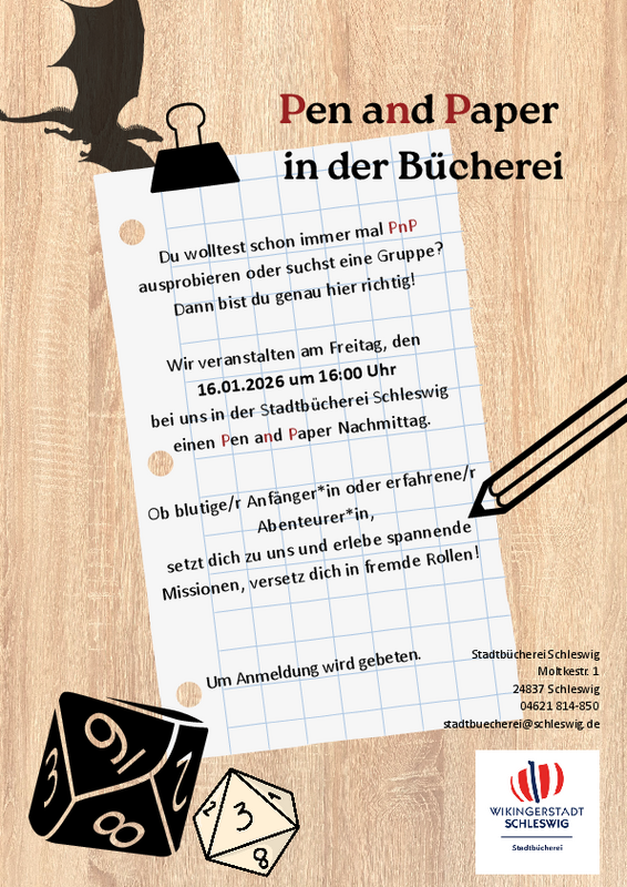 Die Stadtbücherei Schleswig lädt am Freitag, dem 16. Januar 2026, zu einem besonderen Nachmittag rund um das Rollenspiel Pen and Paper (PnP) ein. Ab 16:00 Uhr können Interessierte aller Erfahrungsstufen in die faszinierende Welt von PnP eintauchen.