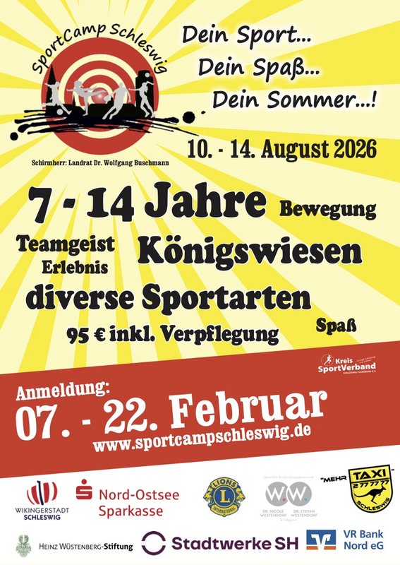 Bereits zum 14. Mal findet vom 10. bis 14. August 2026 das beliebte SportCamp Schleswig statt – und auch in diesem Jahr werden wieder rund 300 Kinder und Jugendliche im Alter von 7 bis 14 Jahren erwartet. Gemeinsam mit einer großen Gruppe engagierter Betreuer*innen, Helfer*innen und Organisator*innen verwandeln sie den Domschulsportplatz an den Königswiesen sowie zahlreiche Sportstätten in und um Schleswig in eine lebendige Camp-Landschaft voller Bewegung, Abenteuer und Teamgeist.
