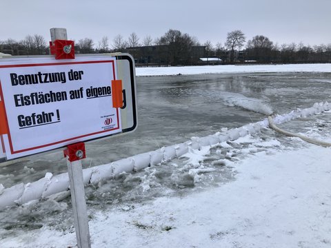 Vor Ort weist ein Hinweisschild darauf hin, dass die Nutzung der Eisfläche auf eigene Gefahr erfolgt. Da es sich um eine natürliche Eisfläche handelt, können Größe, Form und Beschaffenheit je nach Witterung variieren. Die Stadt bittet daher alle Nutzer*innen, aufeinander Rücksicht zu nehmen und insbesondere Kinder nicht unbeaufsichtigt laufen zu lassen.