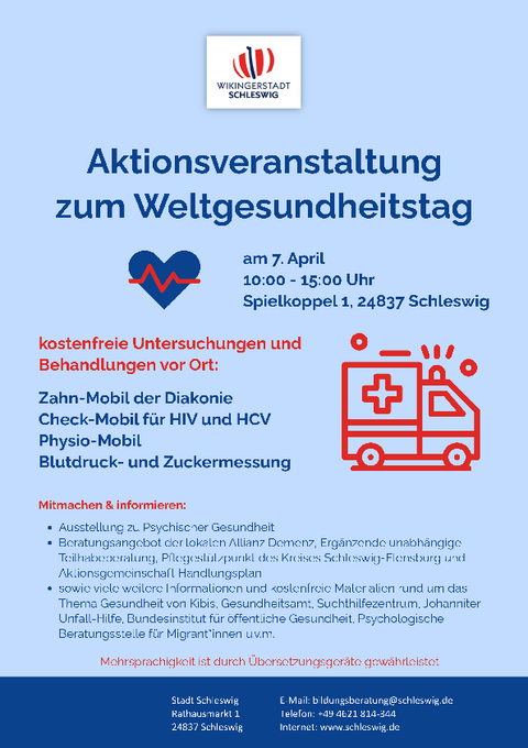 Auch die Stadt Schleswig beteiligt sich am diesjährigen Weltgesundheitstag. Unter dem Motto „Gesundheit gemeinsam stärken“ lädt die Stadt am Dienstag, 7. April 2026, von 10:00 bis 15:00 Uhr zu einer Aktionsveranstaltung zum Weltgesundheitstag an der Gemeinschaftsunterkunft für Geflüchtete, Spielkoppel 1, ein.
