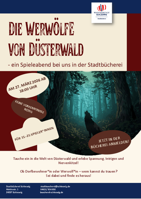 Am Freitag, 27. März 2026, lädt die Stadtbücherei Schleswig zu einem ganz besonderen Spieleabend ein: Gespielt wird „Werwölfe von Düsterwald“, ein mitreißendes Gesellschaftsspiel voller Spannung, Intrigen und Nervenkitzel. Beginn ist um 18:00 Uhr.